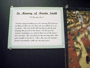 Kristin had been working on this puzzle in Homeroom before Christmas break. After her death, the other kids in the class finished putting it together, but there was one missing piece. They titled it “A Missing Piece” and had it hanging in the classroom for the rest of the year.